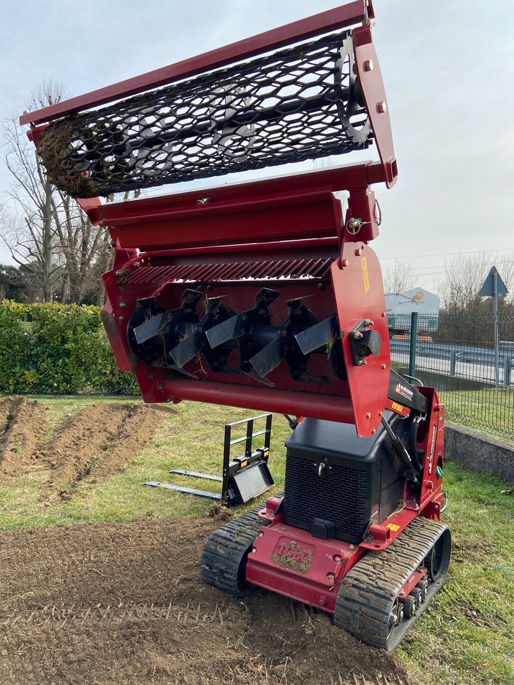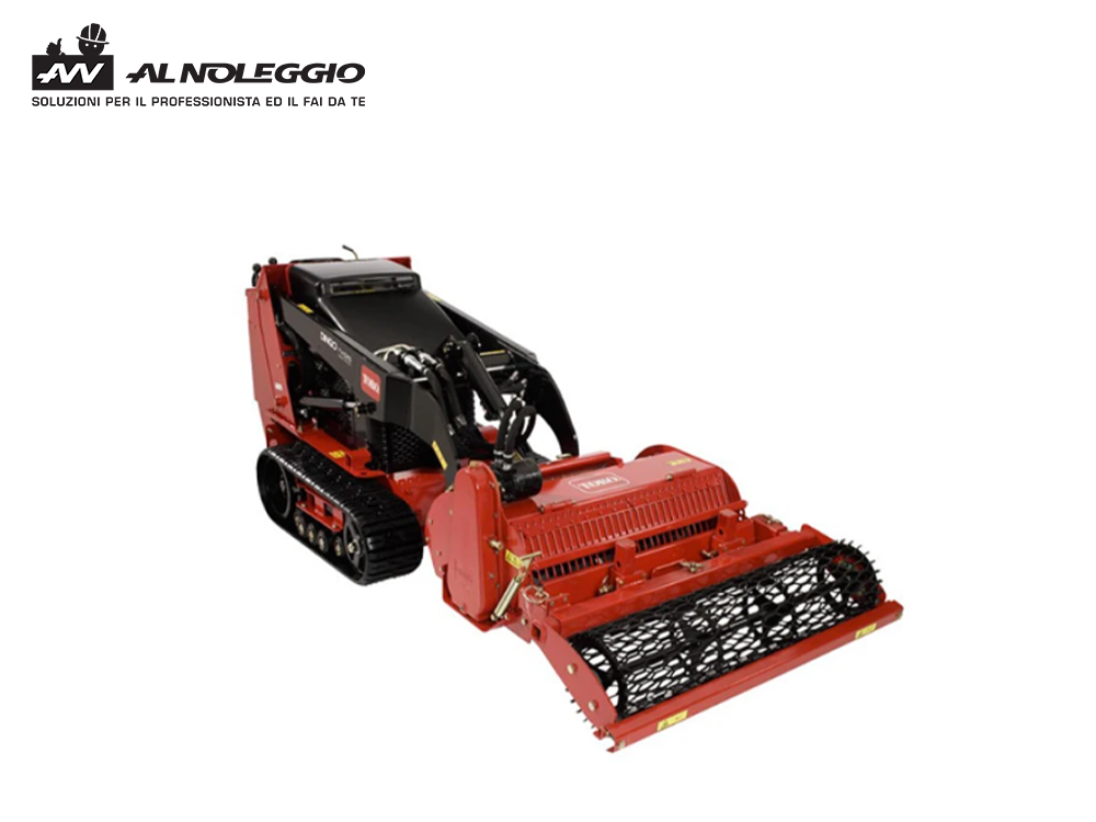 I cingoli garantiscono stabilità e trazione su ogni tipo di terreno, anche su pendii, evitando solchi e riducendo il rischio di danneggiamenti. Le dimensioni compatte e la sterzata a raggio zero consentono di operare facilmente anche in spazi ristretti, mentre i comandi semplici e intuitivi permettono all’operatore di lavorare con precisione e senza fatica.